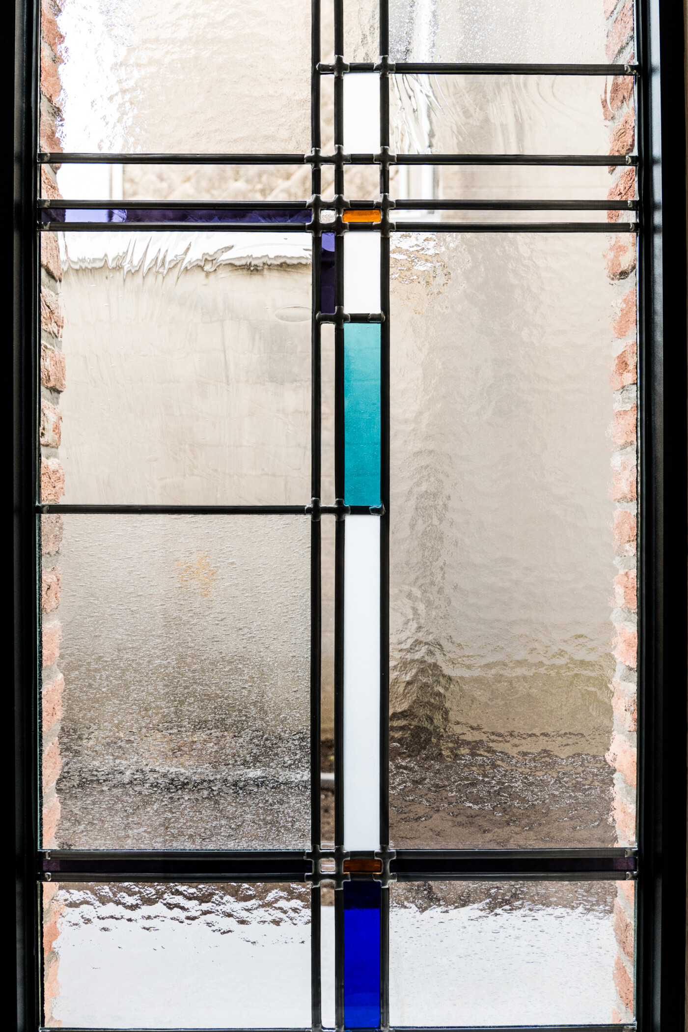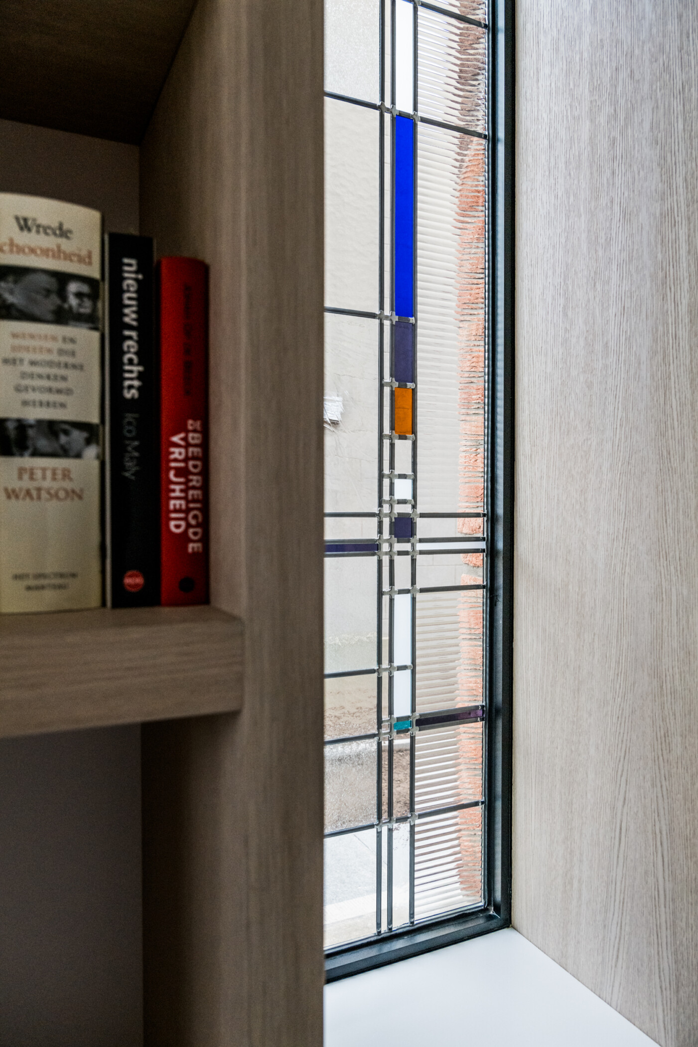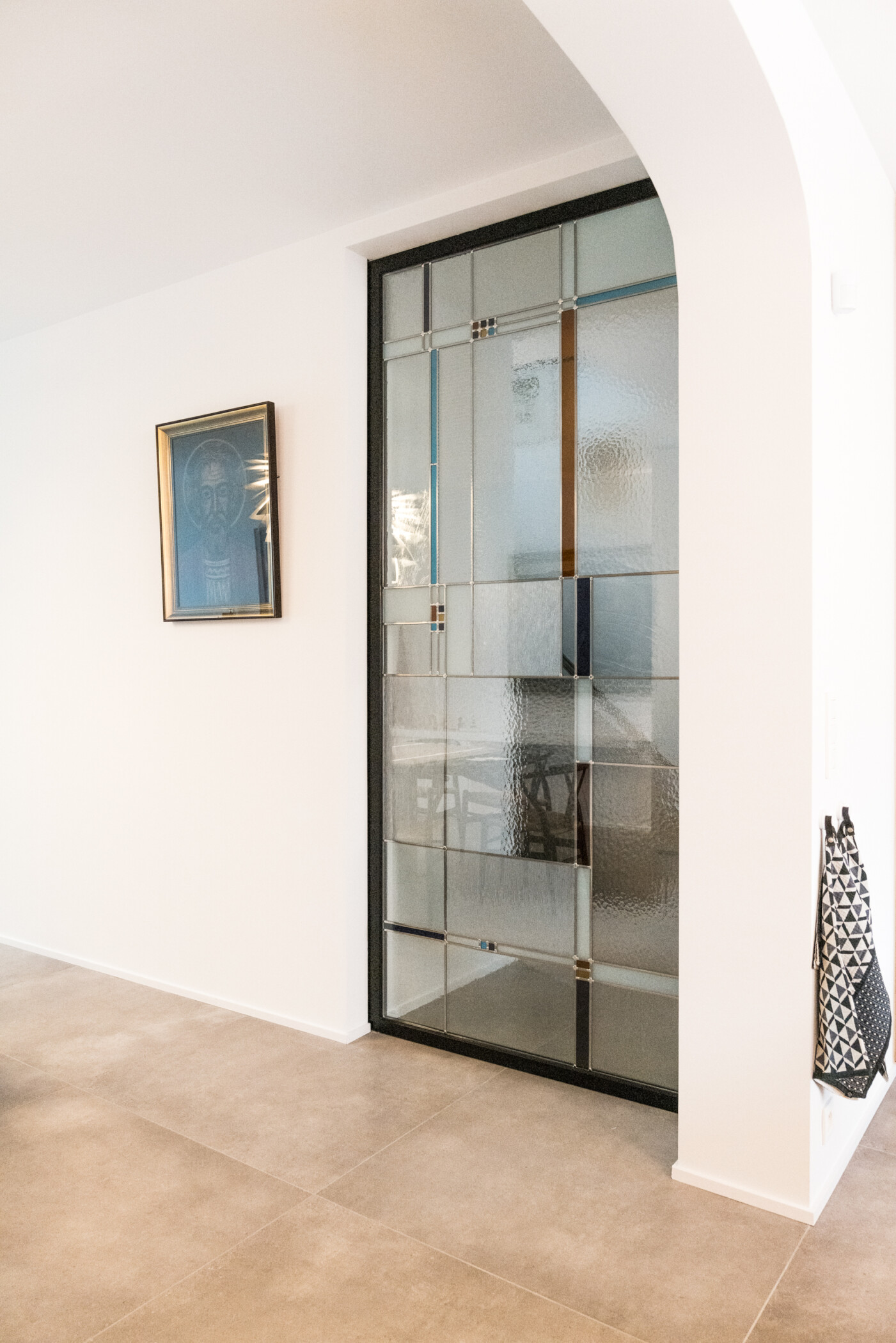 Voor de tweede fase, de grondige renovatie van de benedenverdieping, maakte Studio Artglas 1 binnendeur, 1 schuifdeur en 3 kleine smalle glas-in-lood ramen. Kris: “Ook toen vond het Studio Artglas team een goed compromis tussen onze wensen. De glas-in-lood ramen hebben een prachtig accent in de woning gebracht. We hebben een moderne, Scandinavische smaak die zeer sober is met veel kunst. Die deuren geven net dat beetje kleur en passen er perfect bij. Voor ons is het echt geslaagd!”