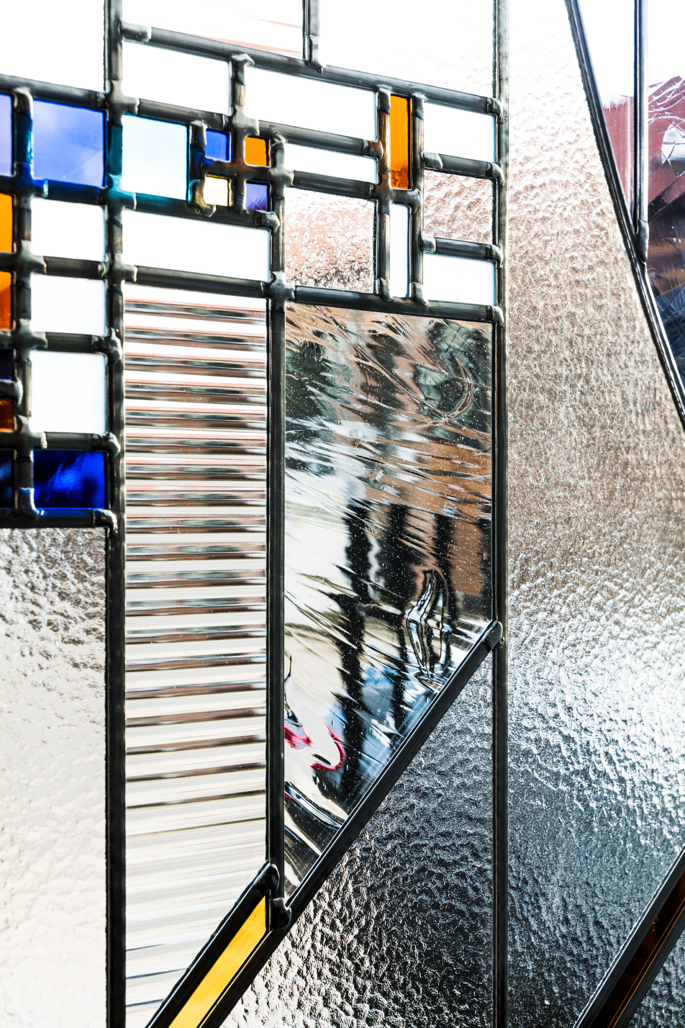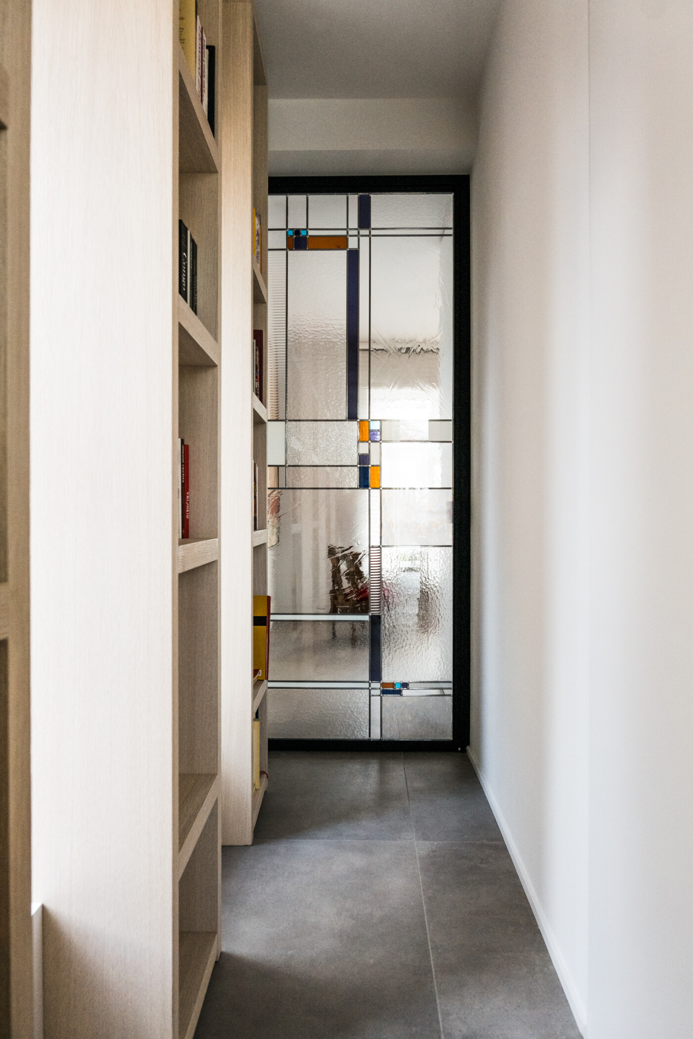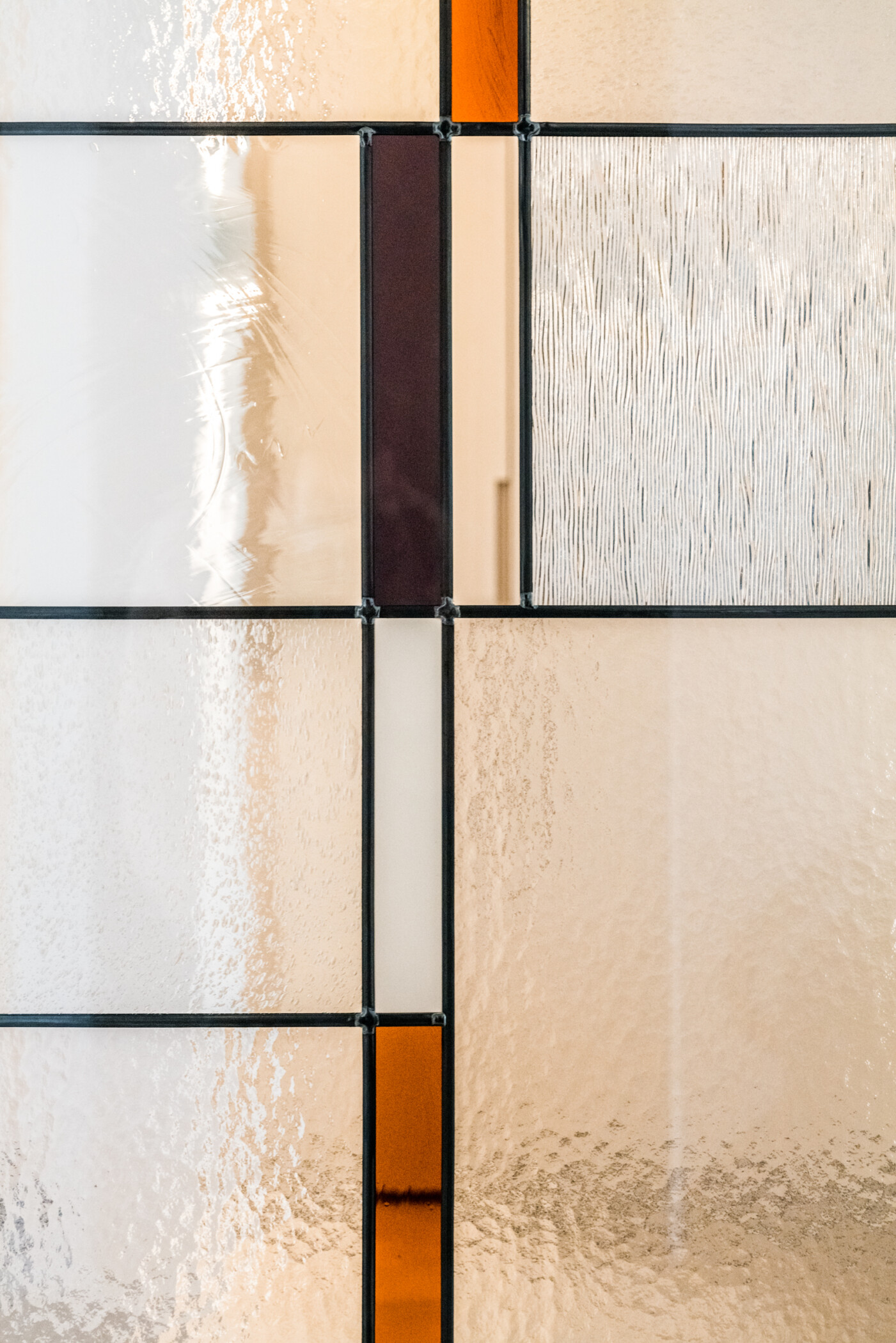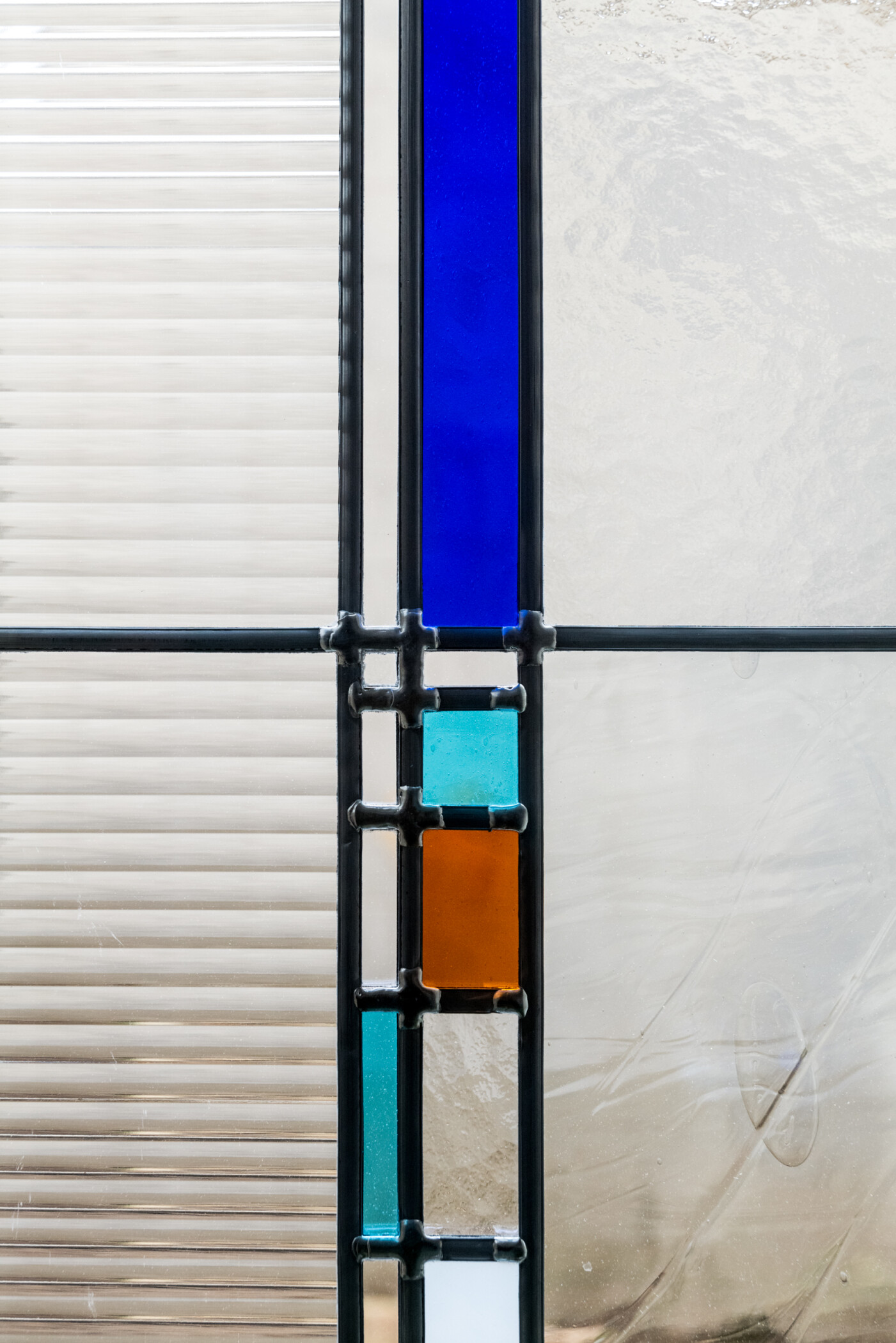 Voor de tweede fase, de grondige renovatie van de benedenverdieping, maakte Studio Artglas 1 binnendeur, 1 schuifdeur en 3 kleine smalle glas-in-lood ramen. Kris: “Ook toen vond het Studio Artglas team een goed compromis tussen onze wensen. De glas-in-lood ramen hebben een prachtig accent in de woning gebracht. We hebben een moderne, Scandinavische smaak die zeer sober is met veel kunst. Die deuren geven net dat beetje kleur en passen er perfect bij. Voor ons is het echt geslaagd!”
