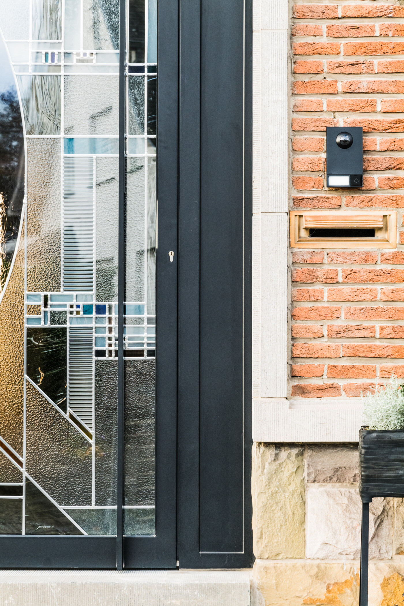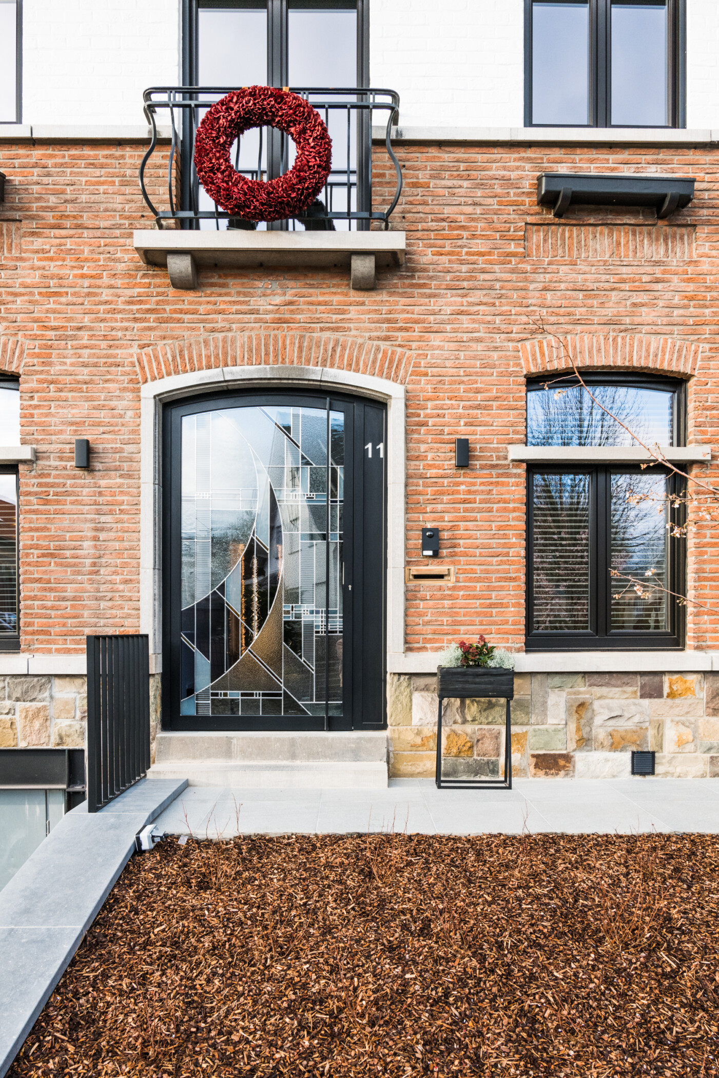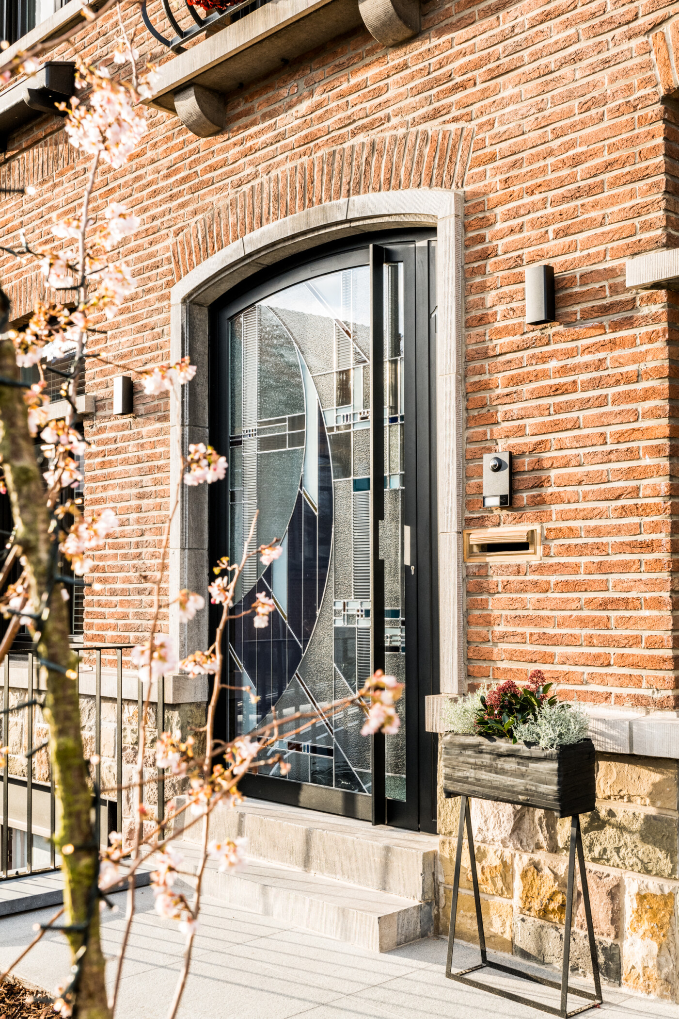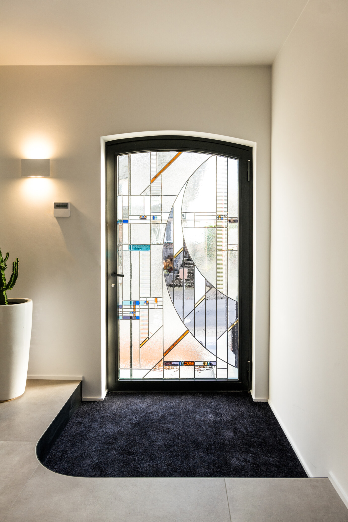 Het project verliep in twee fases. Kris: “Voor het design van de voordeur zijn we naar het atelier van Studio Artglas in Zonhoven gegaan. We zijn daar heel goed en aangenaam ontvangen. We kregen uitgebreide informatie en zagen verschillende mogelijkheden. Het team dacht meteen mee. Mijn man wou het iets complexer, ik wou het wat soberder. Ze hebben hierin een mooi evenwicht gevonden.”